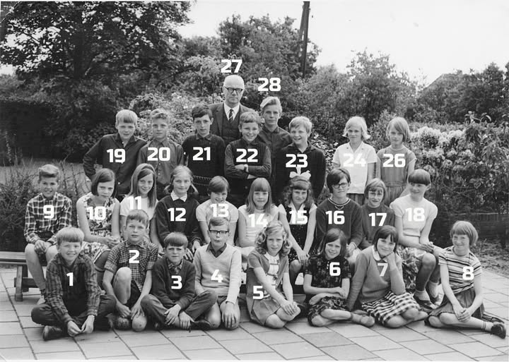 3. Jan Dunnewind 4. Johan Dingerink? 5. Jan Dijk 7. Henk Lingerman 9. Henk van de Weterink 10 Mevr. van Nee 11. Meester van Nee (hoofd der school) 13. Bert Goldsteen 14. Lineke Kok 15. Meester Spijkerboer 16. ? 17. Peter Aalbers 20. Henk van Gerner 21. Derk van Lenthe 25. Gerrit Goldsteen 26. Berend Veldkamp 33. John Buis 41. Ria van Emst 52. Tonnie Grolleman 53. Arie Aalbers